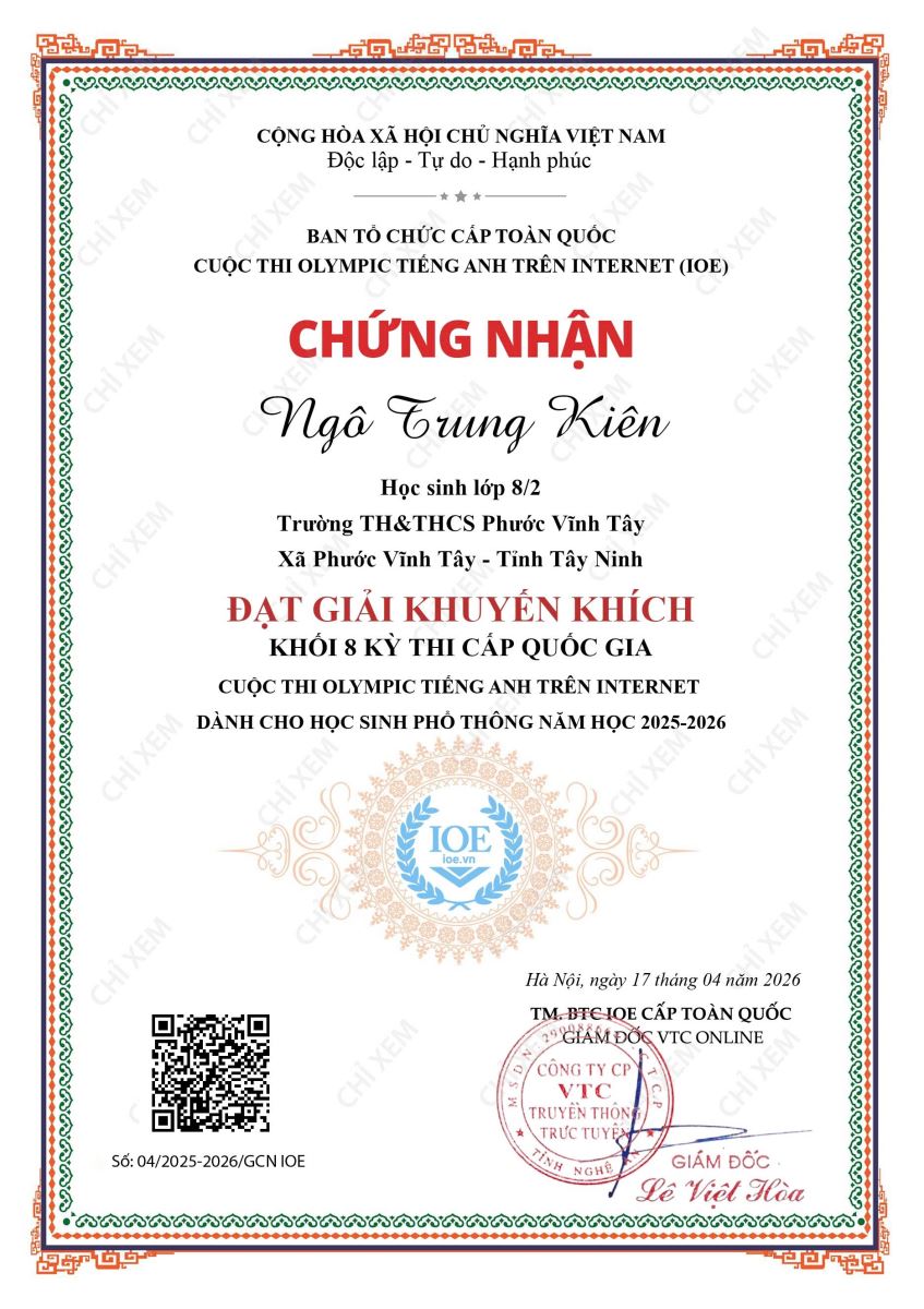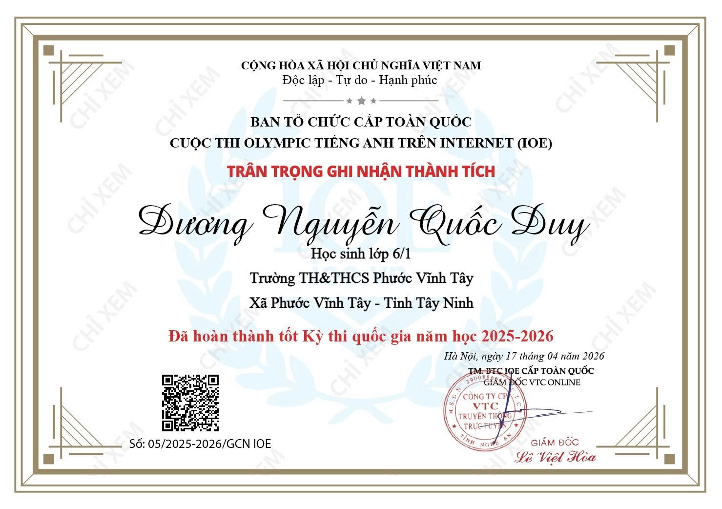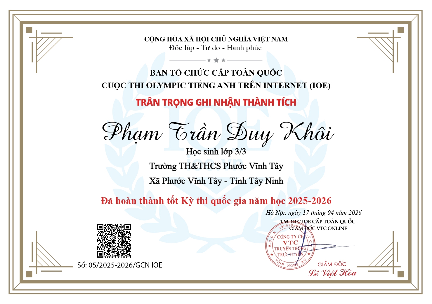 Kỳ thi Olympic Tiếng Anh trên Internet (IOE) cấp Quốc gia năm học 2025–2026 đã khép lại với những kết quả đáng khích lệ. Trường Tiểu học và THCS Phước Vĩnh Tây vui mừng ghi nhận thành tích của các em học sinh đã nỗ lực hết mình và hoàn thành tốt phần thi.